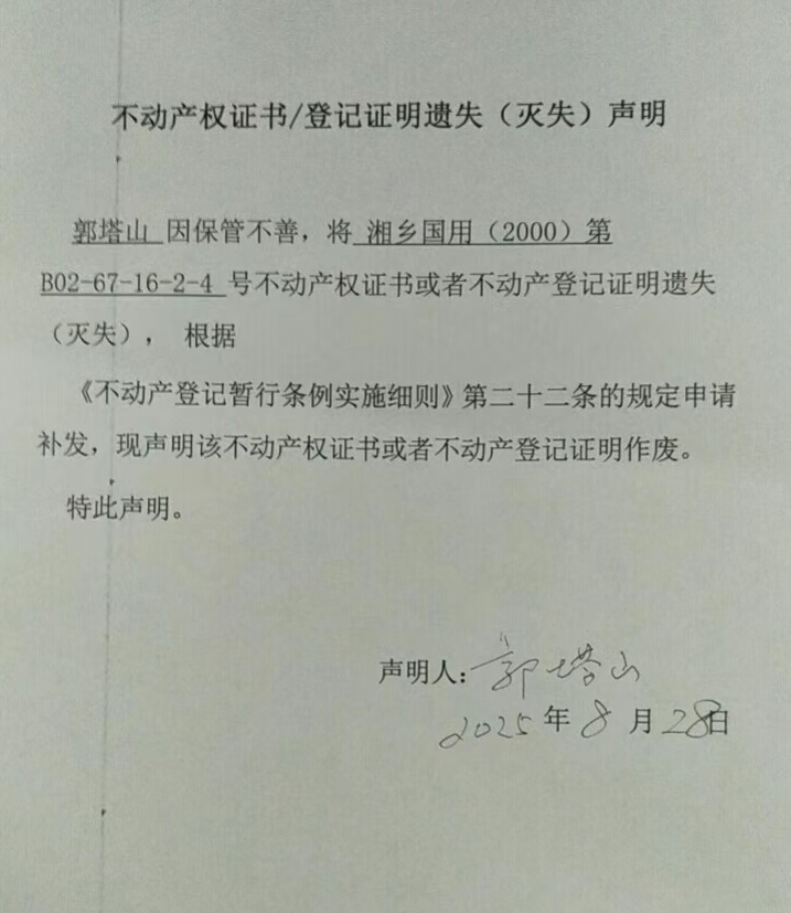 不動產(chǎn)權(quán)證書遺失聲明(郭塔山)