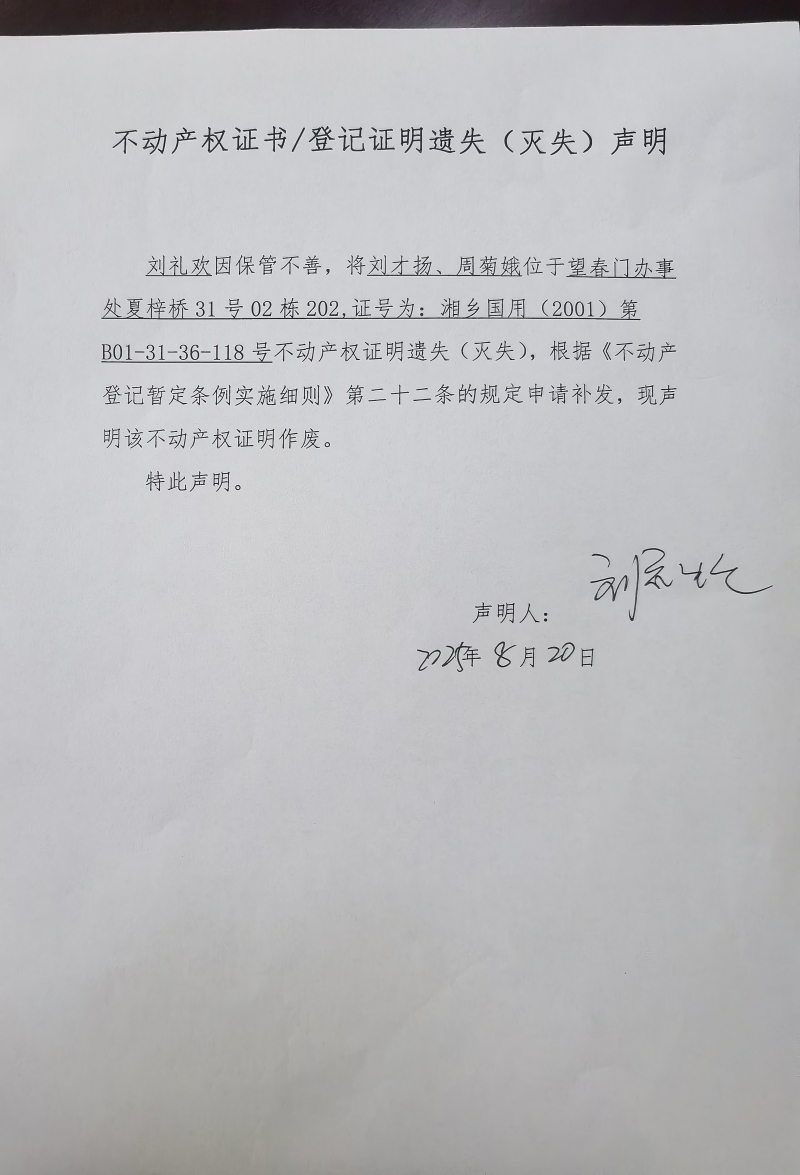 不動產權證書遺失聲明(劉才揚、周菊娥)