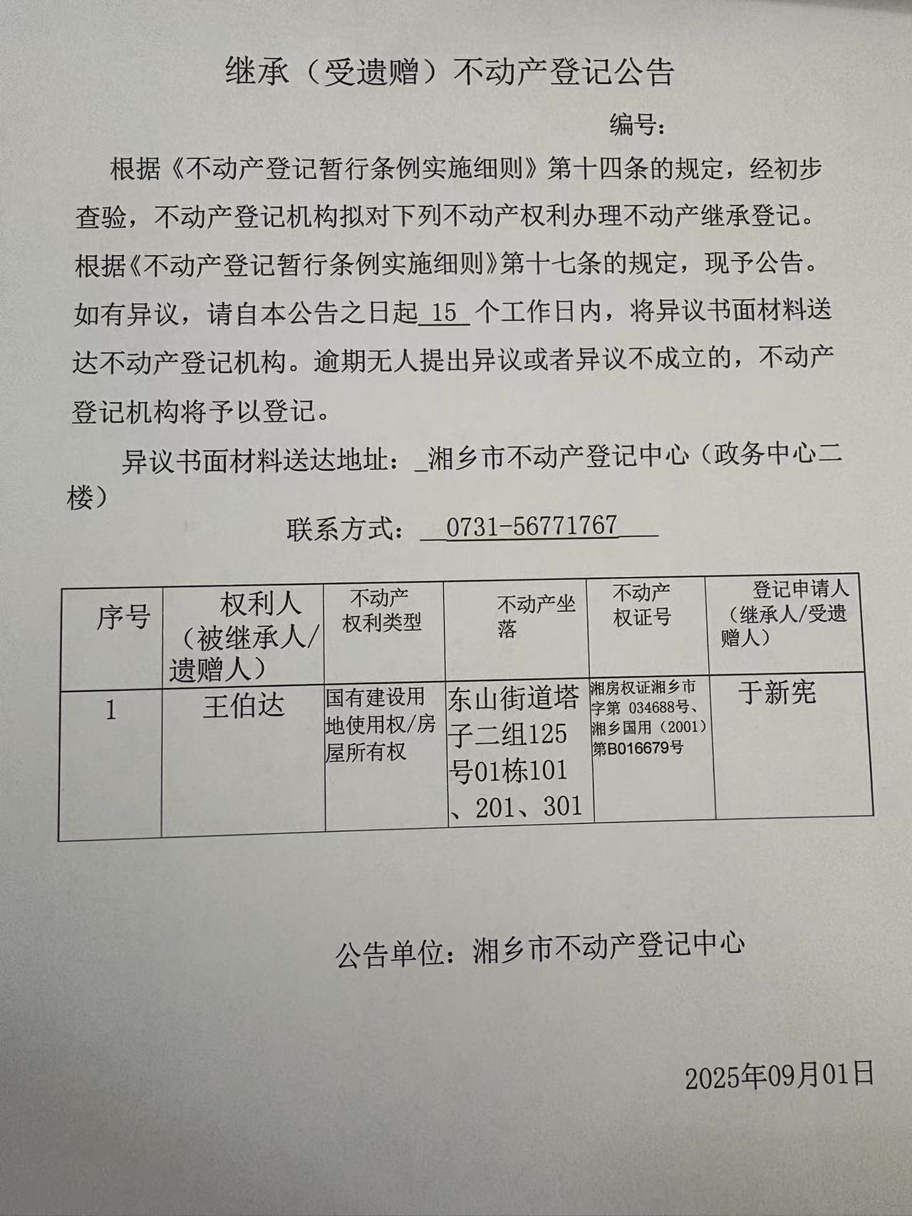 索引號:4303000006/2025-1389922 發布機構:不動產信息公開 發布目錄:不動產登記公告