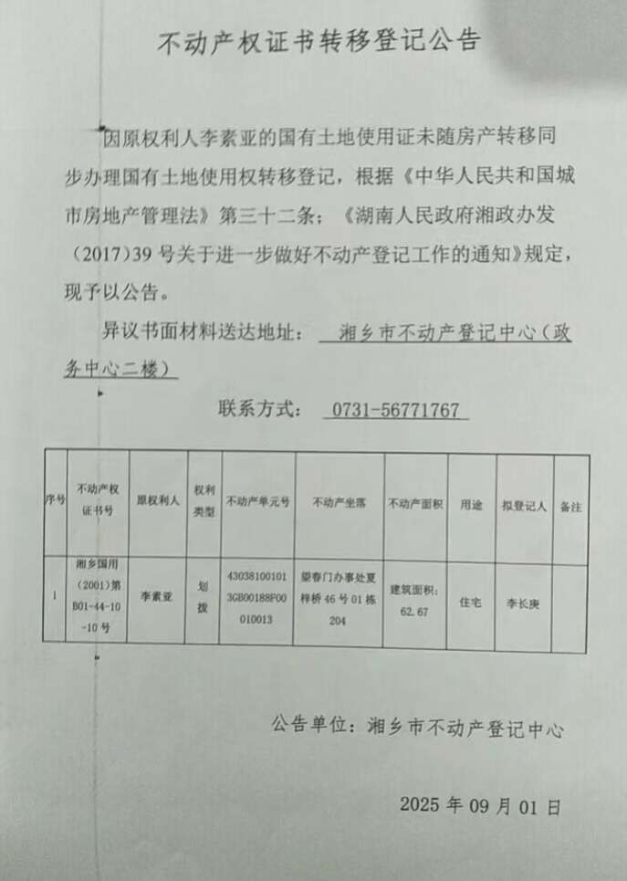 索引號:4303000006/2025-1389940 發布機構:不動產信息公開 發布目錄:不動產登記公告