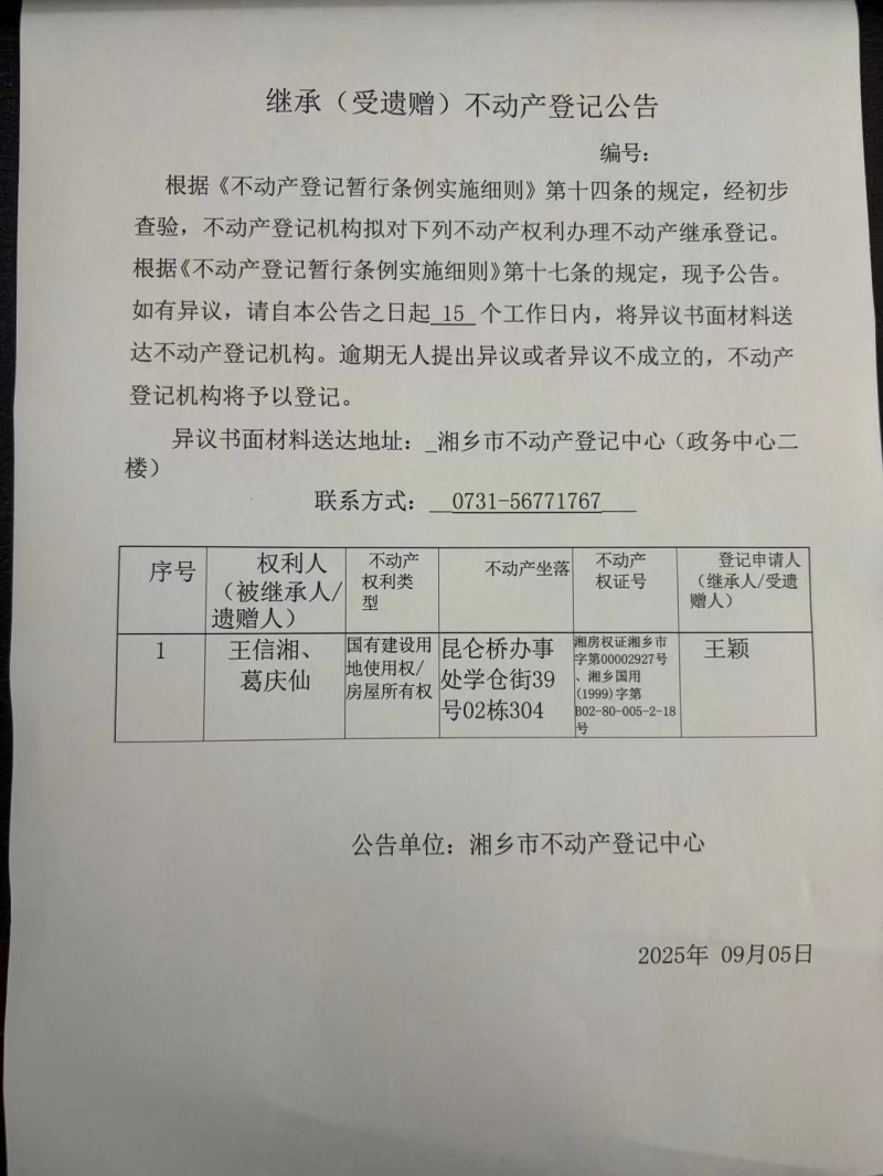 索引號:4303000006/2025-1390963 發布機構:不動產信息公開 發布目錄:不動產登記公告