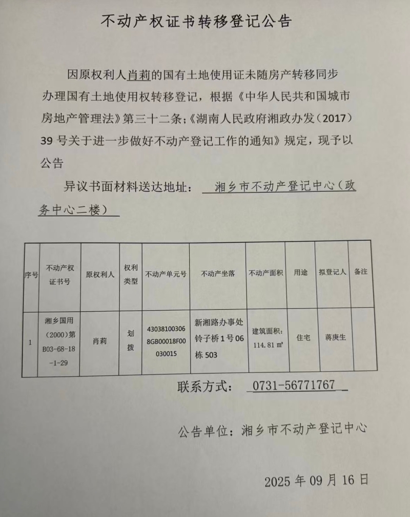 索引號:4303000006/2025-1392256 發布機構:不動產信息公開 發布目錄:不動產登記公告