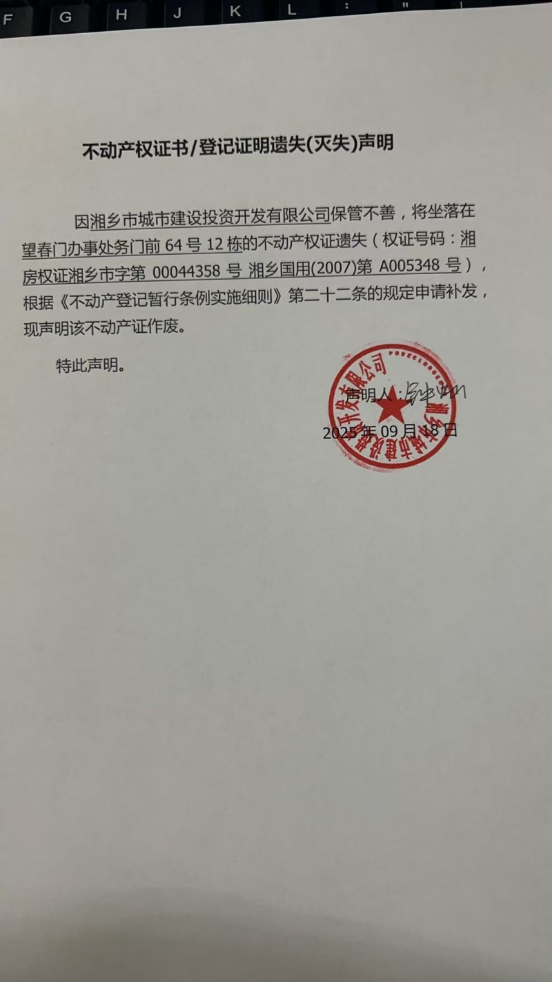 不動(dòng)產(chǎn)權(quán)證書(shū)遺失聲明(湘鄉(xiāng)市城市建設(shè)投資開(kāi)發(fā)有限公司)