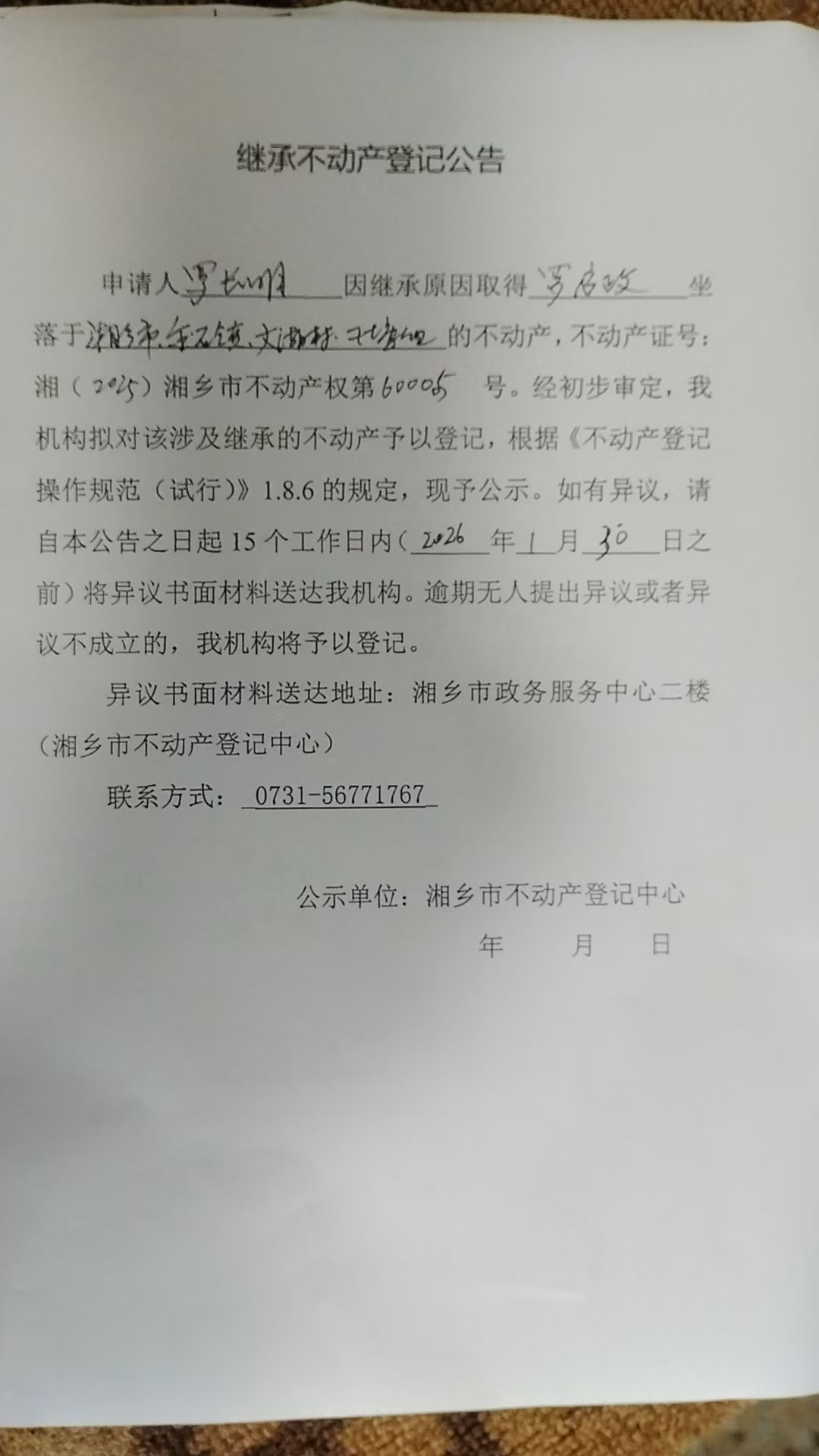 索引號:4303000006/2026-1412174 發布機構:不動產信息公開 發布目錄:不動產登記公告