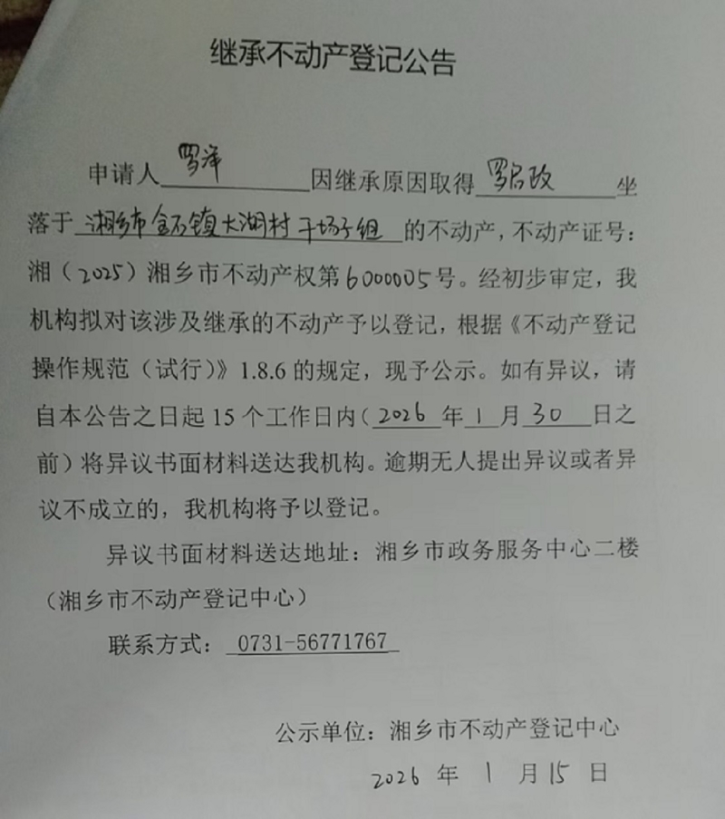索引號:4303000006/2026-1413274 發布機構:不動產信息公開 發布目錄:不動產登記公告