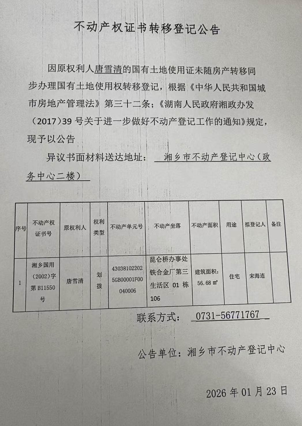 索引號:4303000006/2026-1415163 發布機構:不動產信息公開 發布目錄:不動產登記公告