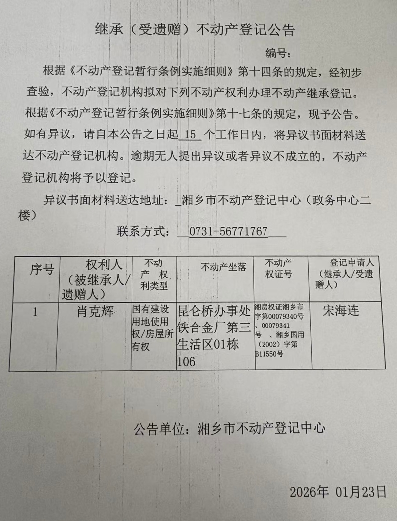 索引號:4303000006/2026-1415166 發布機構:不動產信息公開 發布目錄:不動產登記公告