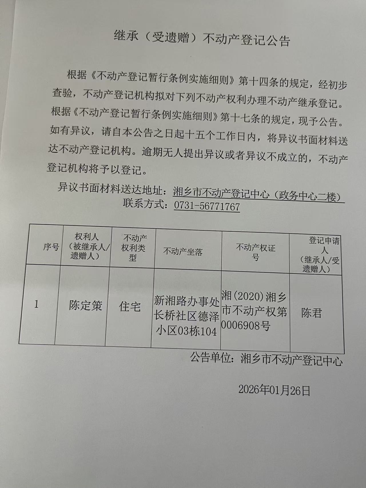 索引號:4303000006/2026-1415371 發布機構:不動產信息公開 發布目錄:不動產登記公告