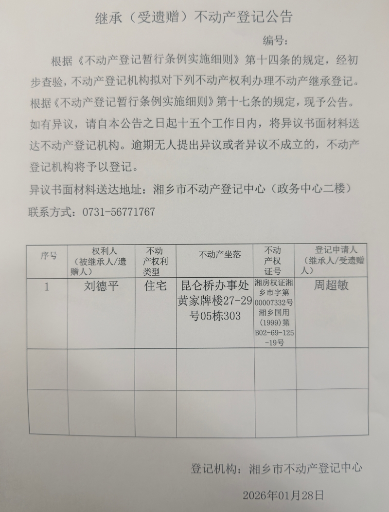 索引號:4303000006/2026-1416084 發布機構:不動產信息公開 發布目錄:不動產登記公告