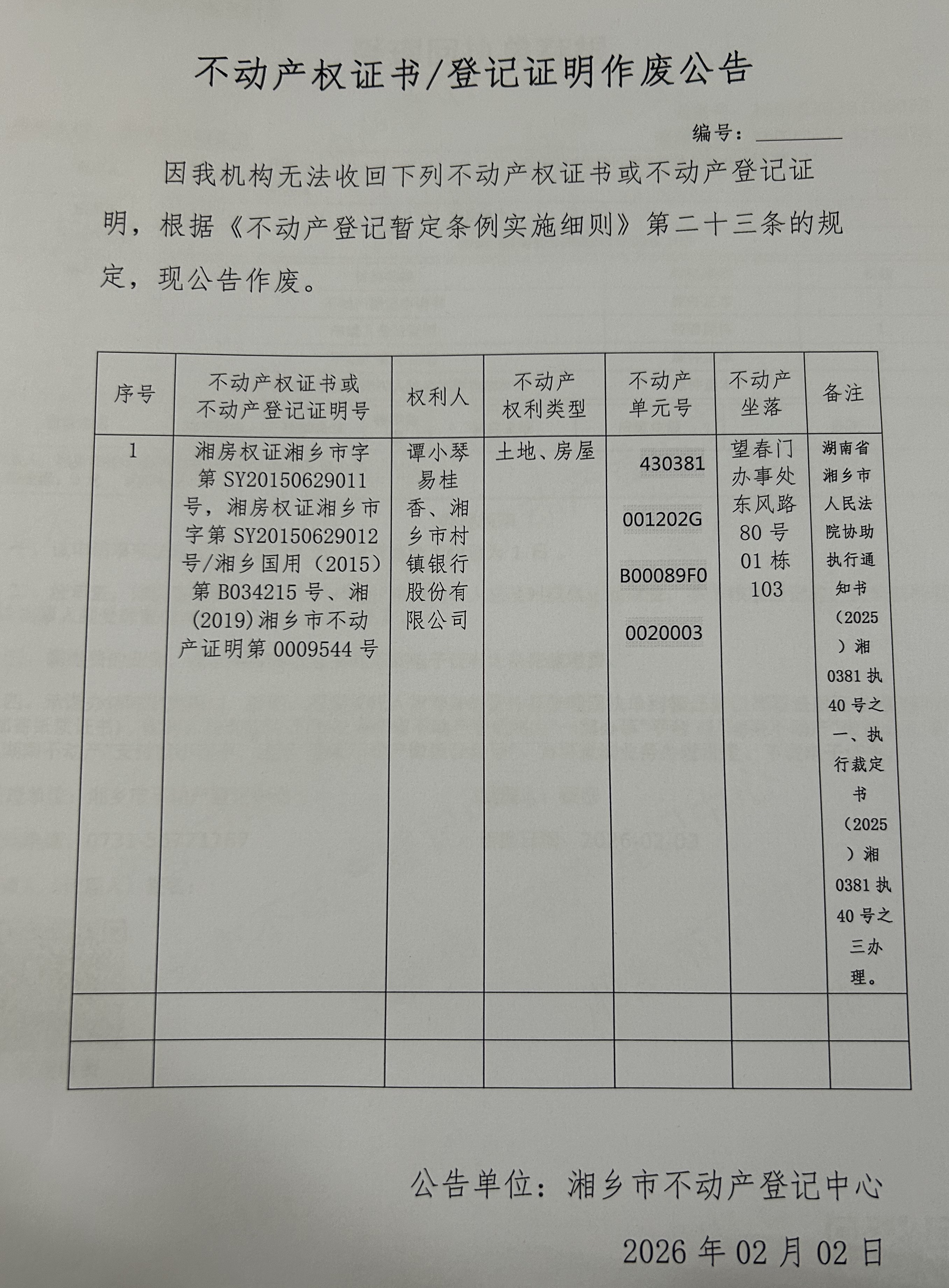 譚小琴、易桂香(不動(dòng)產(chǎn)作廢公告)