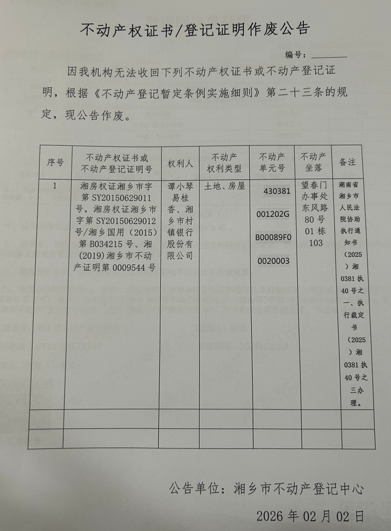 索引號(hào):4303000006/2026-1417146 發(fā)布機(jī)構(gòu):不動(dòng)產(chǎn)信息公開 發(fā)布目錄:不動(dòng)產(chǎn)登記公告