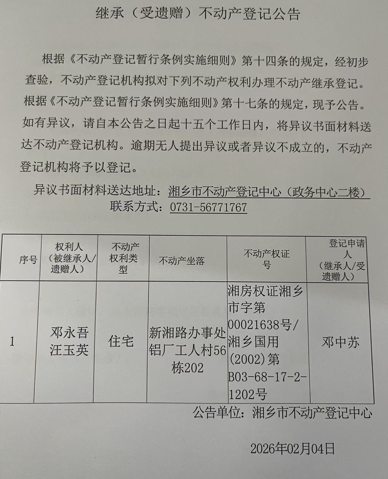 索引號:4303000006/2026-1417433 發布機構:不動產信息公開 發布目錄:不動產登記公告