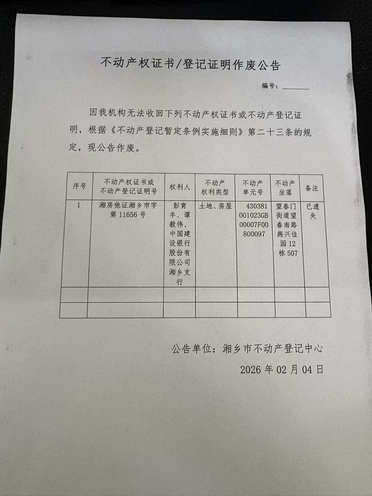 不動產權證書作廢公告(彭育豐、譚毅偉、中國建設銀行股份有限公司湘鄉支行)