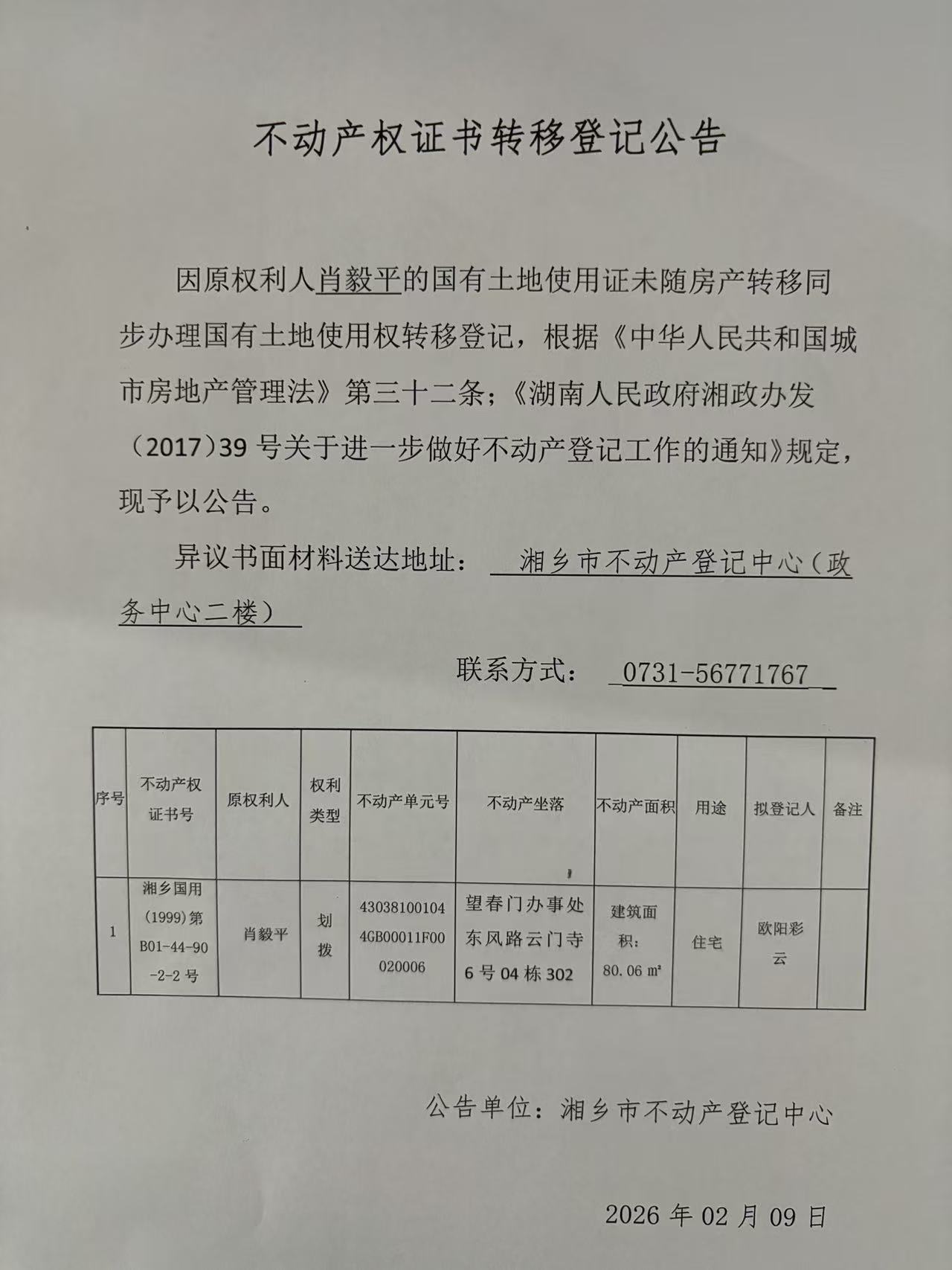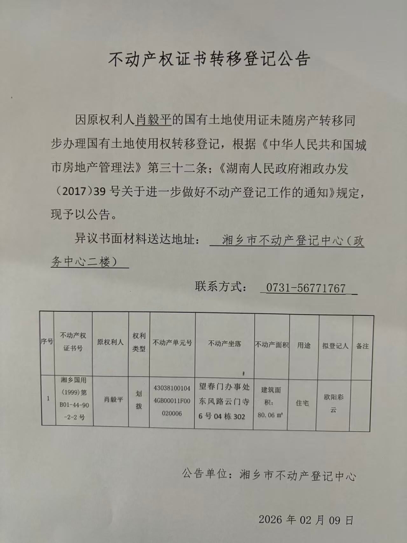 索引號:4303000006/2026-1417976 發布機構:不動產信息公開 發布目錄:不動產登記公告