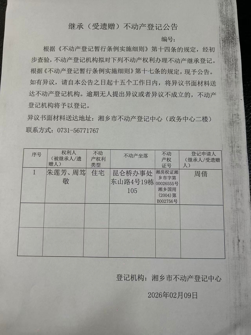 索引號:4303000006/2026-1418051 發布機構:不動產信息公開 發布目錄:不動產登記公告