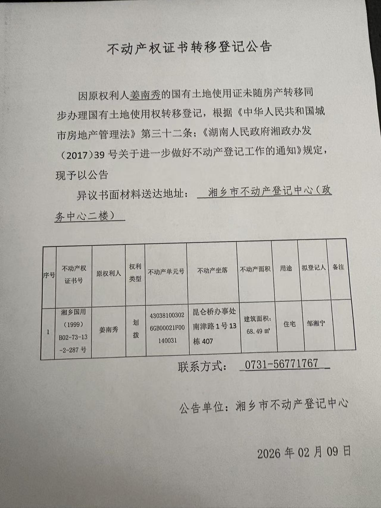 索引號:4303000006/2026-1418060 發(fā)布機構(gòu):不動產(chǎn)信息公開 發(fā)布目錄:不動產(chǎn)登記公告