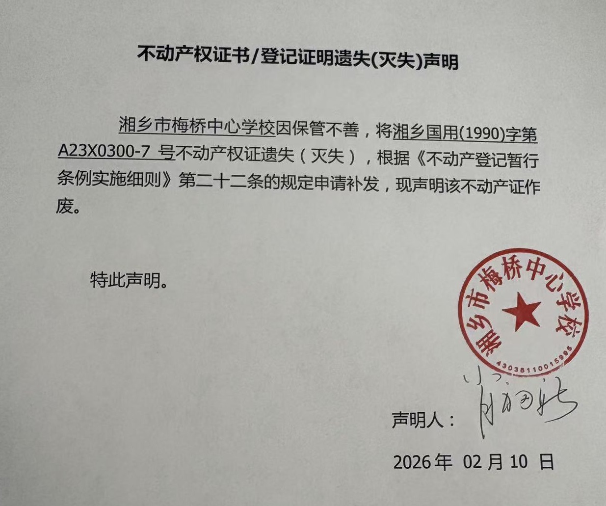 湘鄉市梅橋中心學校(不動產遺失聲明)