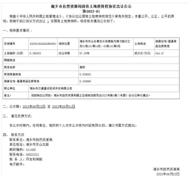 湘鄉市自然資源局國有土地使用權協議出讓公示(協2023-01號)