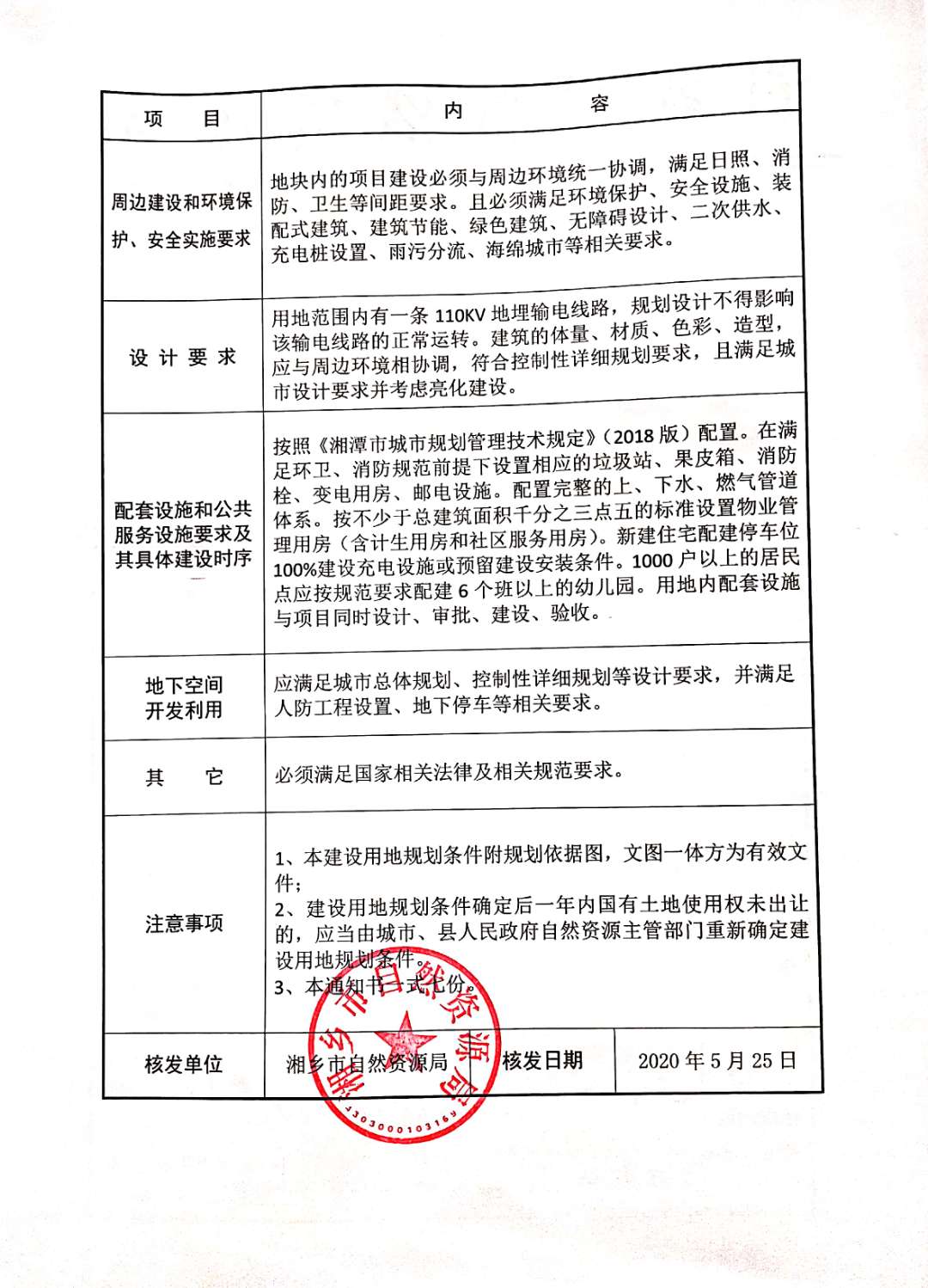 八、該宗地總面積28340.55平方米,此次出讓為第一期,面積24630.72平方米,受讓人須結(jié)合總面積28340.55平方米進行整體規(guī)劃,須在第二期土地(3709.83平方米)掛牌時參與土地競買,且報價單價不得低于此次競買起始單價。宗地范圍圖內(nèi)有一條110KV地埋輸電線路須保留,土地受讓人應(yīng)按規(guī)范設(shè)計、施工,不得影響該輸電線路。按規(guī)劃條件建設(shè)。