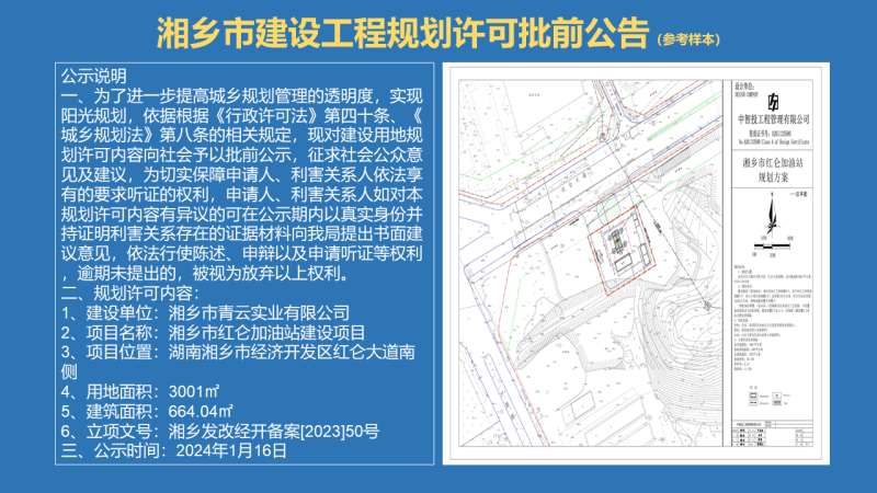 湘鄉(xiāng)市建設工程規(guī)劃許可批前公告(紅侖加油站)