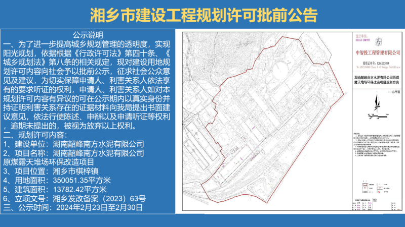 湘鄉(xiāng)市建設(shè)工程規(guī)劃許可批前公告(韶峰南方水泥原煤露天堆場環(huán)保改造項目)
