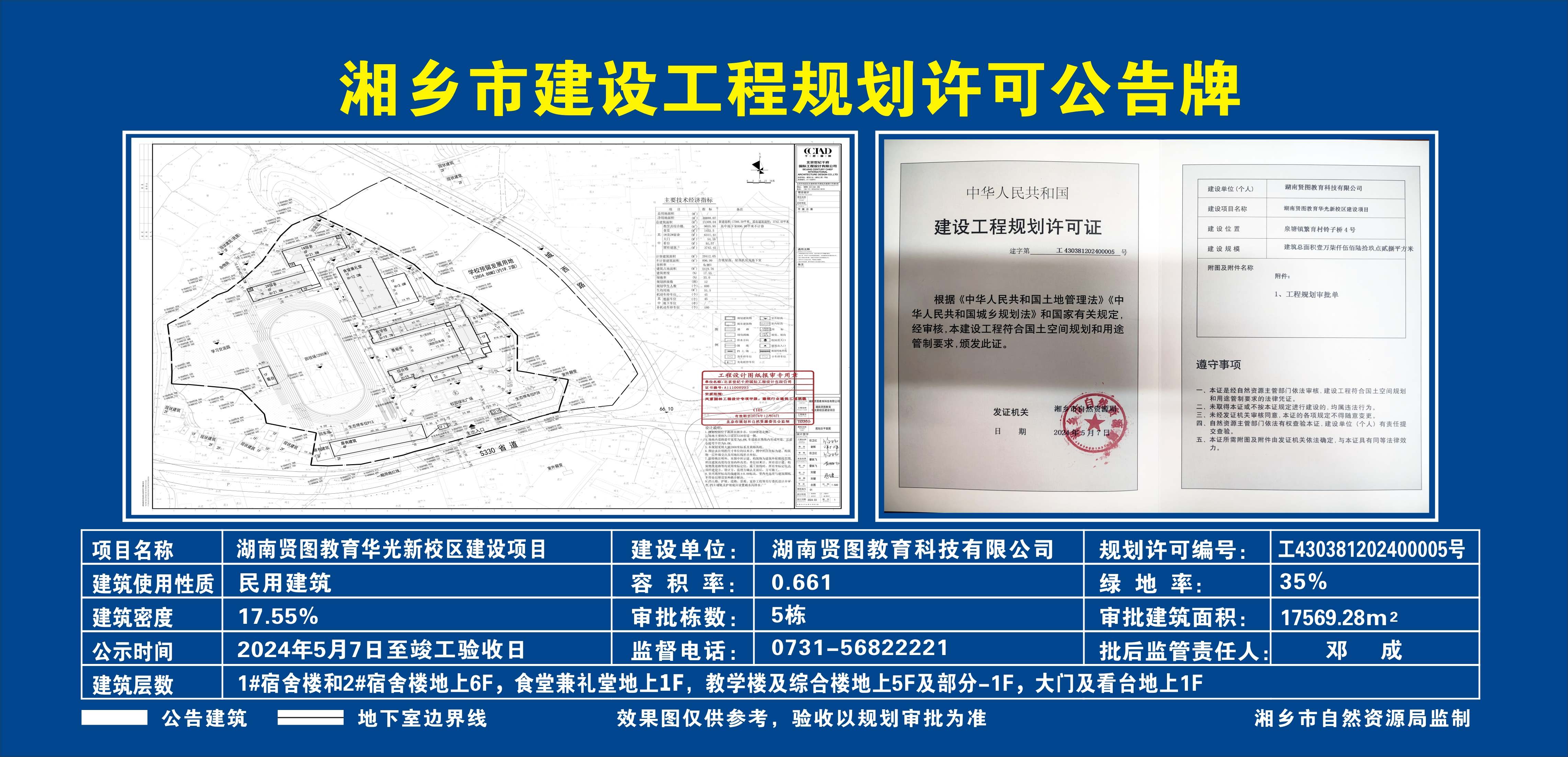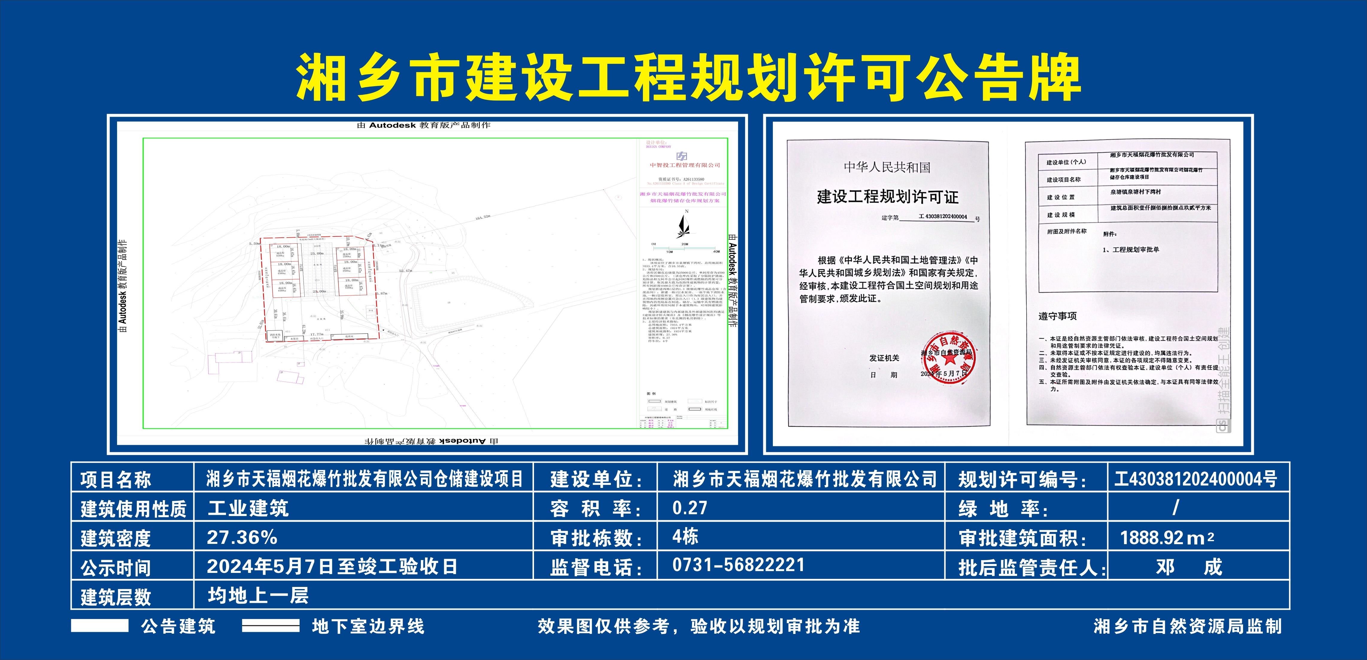 建設工程規(guī)劃許可批后公告:湘鄉(xiāng)市天福煙花爆竹批發(fā)有限公司煙花爆竹儲存?zhèn)}庫建設項目;湖南賢圖教育華光新校區(qū)建設項目