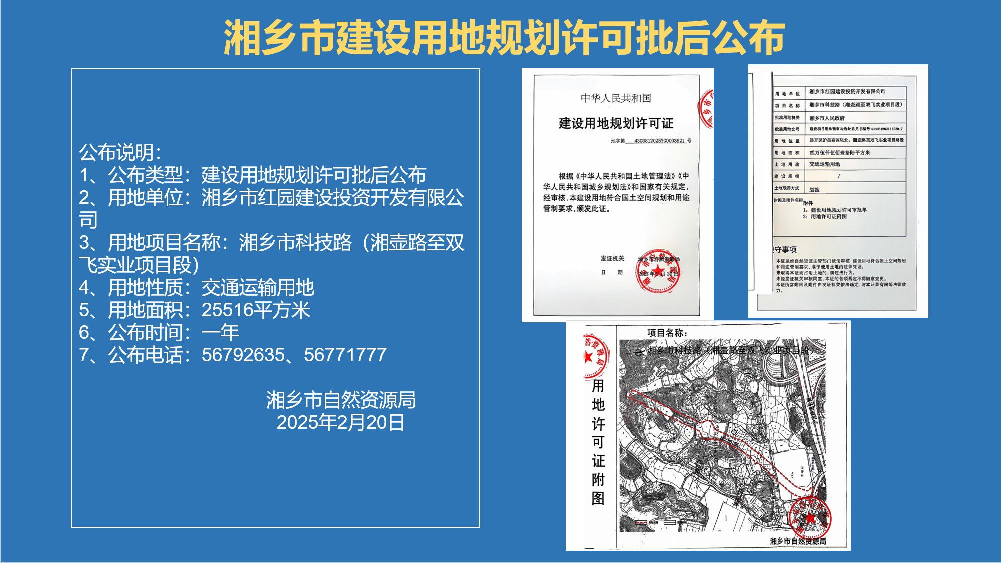 湘鄉市科技路(湘壺路至雙飛實業項目段)建設用地許可批后公示