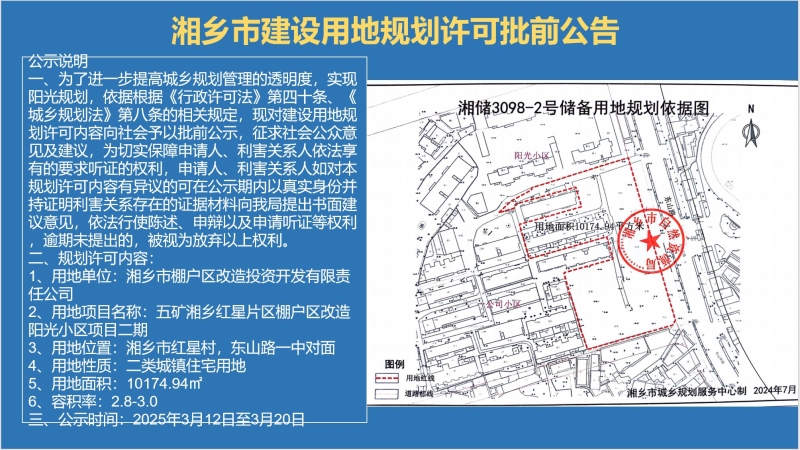 五礦湘鄉紅星片區棚戶區改造陽光小區項目二期建設用地規劃許可批前公示
