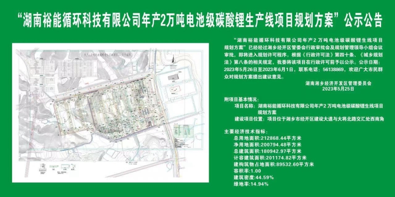 “湖南裕能循環科技有限公司年產2萬噸電池級碳酸鋰生產線項目規劃方案”公示公告