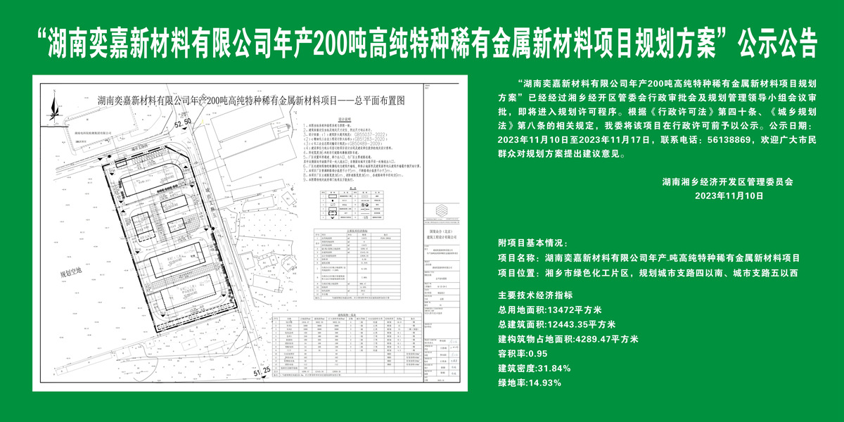 “湖南奕嘉新材料有限公司年產200噸高純特種稀有金屬新材料項目規劃方案” 公示公告