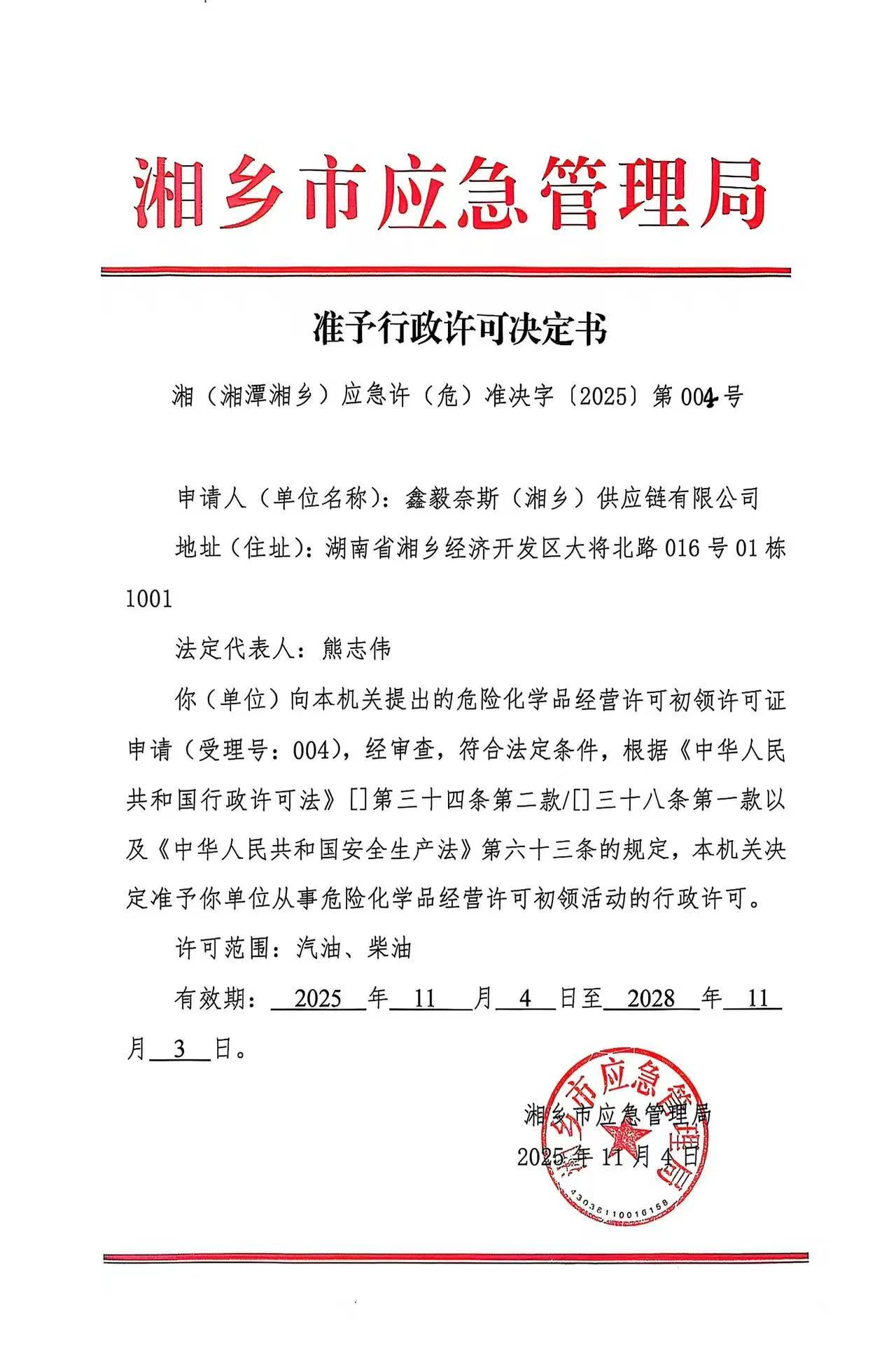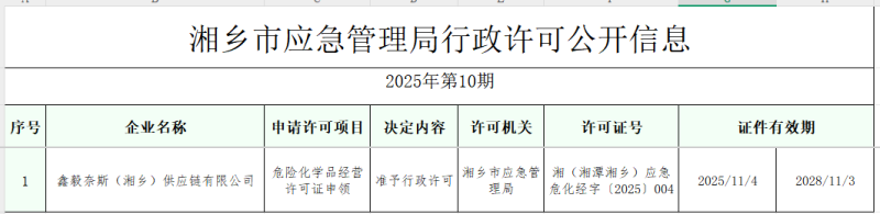 湘鄉市應急管理局 準予行政許可決定書
