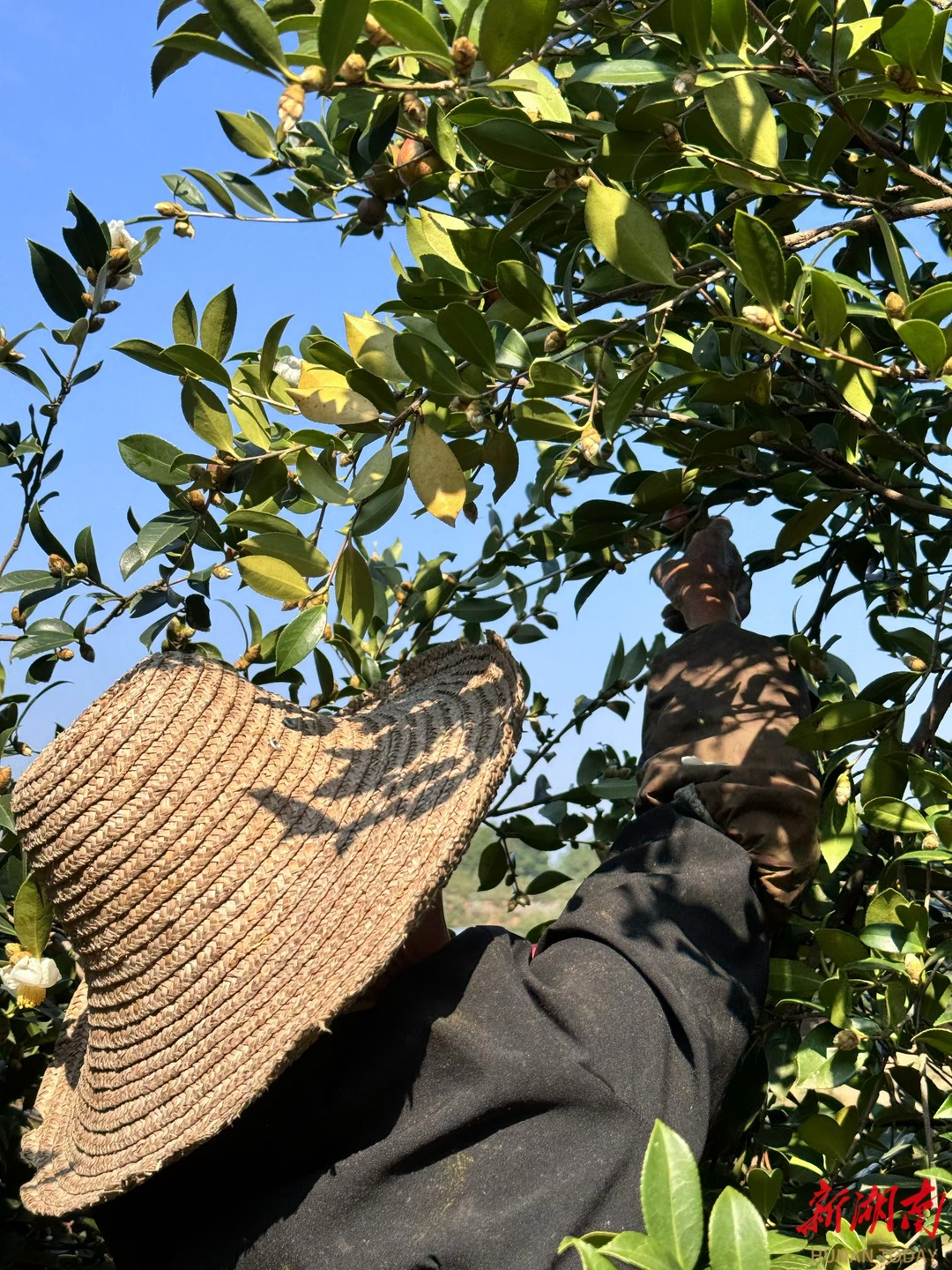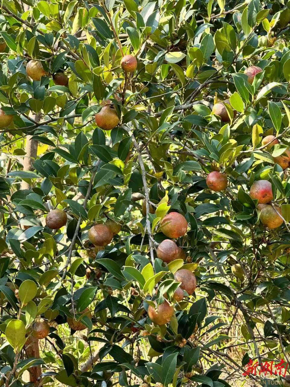 霜降過后,湘鄉市月山鎮石柱村豐利油茶專業合作社基地,一簇簇成熟茶籽青里帶紅,沉甸甸的,將樹枝壓彎了腰。枝頭上還夾著白色的茶花,散發著淡淡的清香。