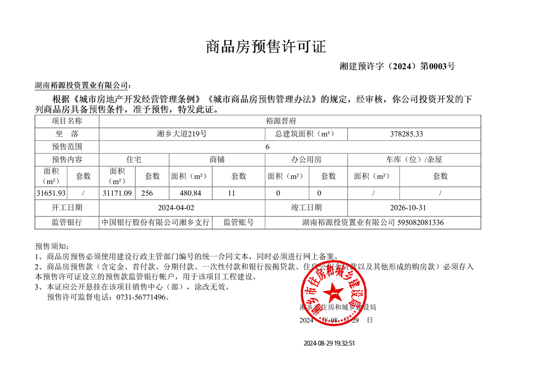 索引號:4303000006/2024-1340175 發布機構:行政執法 發布目錄:商品房預售許可