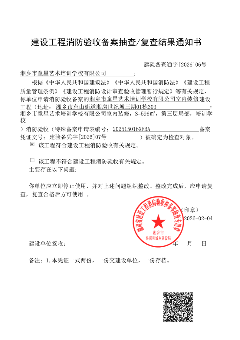 索引號:4303000006/2026-1420071 發布機構:行政執法 發布目錄:建設工程消防驗收備案