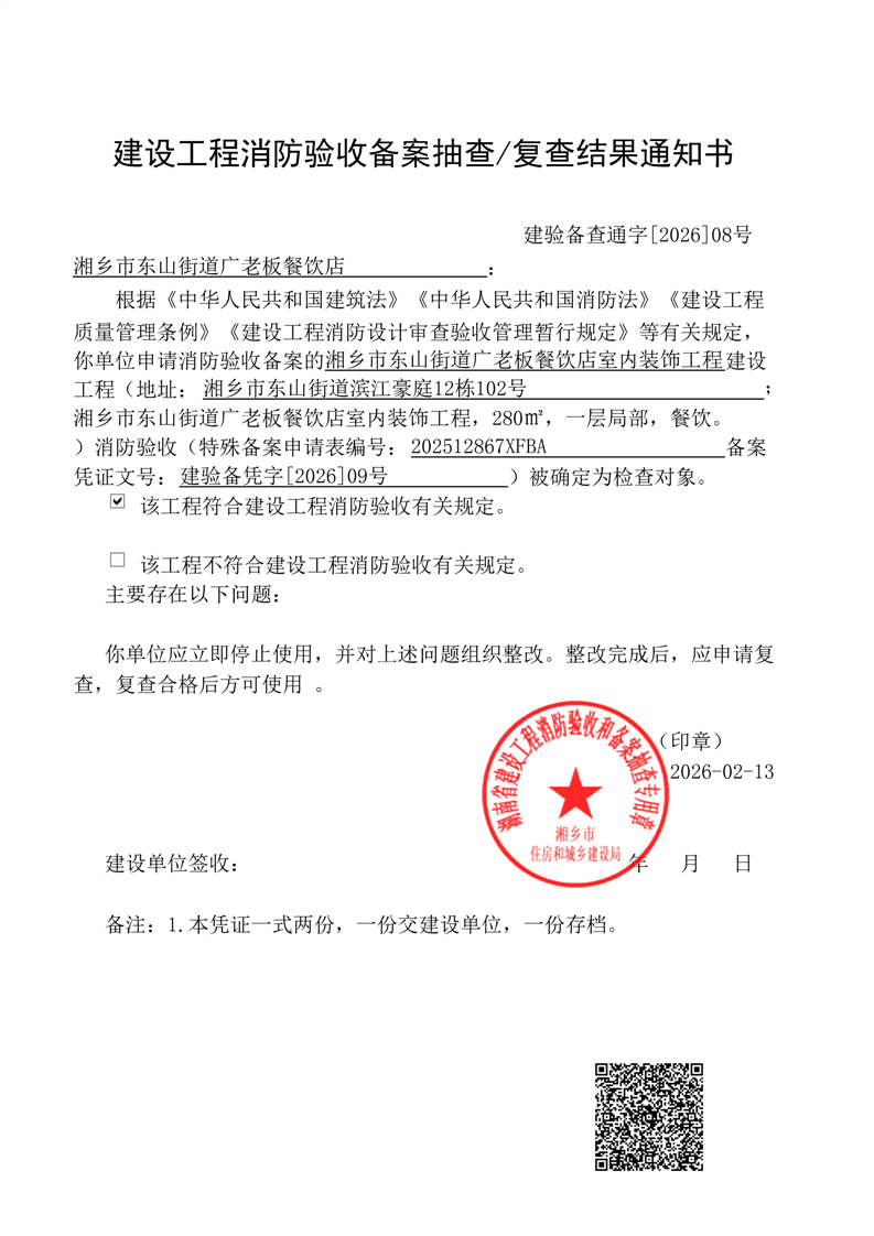 索引號:4303000006/2026-1420079 發布機構:行政執法 發布目錄:建設工程消防驗收備案