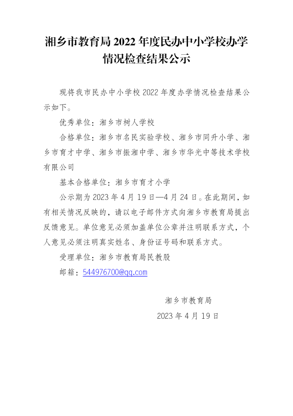 湘鄉(xiāng)市教育局2022年度民辦中小學(xué)校辦學(xué)情況檢查結(jié)果公示