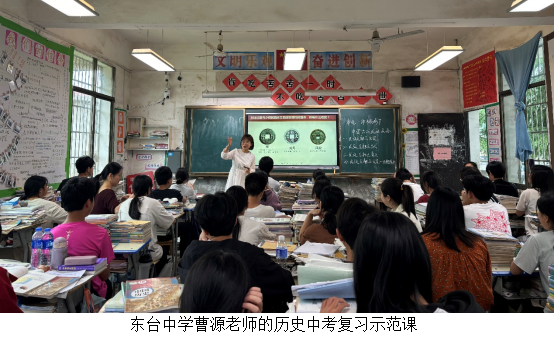 活動中,東臺中學優秀教師代表曹源、楊玉珍老師分別展示了一節歷史、政治中考復習示范課。兩位老師,在深度解讀“新課標”的基礎上,以提升學生的核心素養為導向,采用大概念教學,通過設置情境,引導學生畫思維導圖,拓展史料等形式,注重學科內和學科間知識的整合和融合,注重學校教育和現實世界需求之間的聯系,充分調動學生的主動性,以此引導學生建立時空觀、實踐觀、史料史證觀等,將素質教育落于課堂實處。