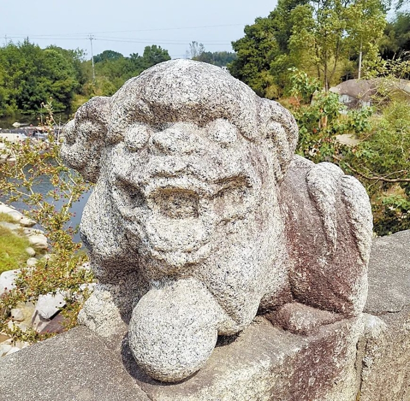 ▲橋欄桿上的石獅。(谷桔 攝)北面欄桿上蹲著兩只小石獅,雖然歲月模糊了它們的面容,但威武之態依稀可辨。繼續往西頭走,會遇見北面欄桿上那兩只臥著的小石牛,一只循規蹈矩似是準備吃草,另一只則調皮地把頭扭向身后,憨態可掬的模樣讓人忍俊不禁。但錦屏橋橋面卻是水泥鋪就的,古樸厚重的花崗石砌橋欄桿上,冷不丁也會發現水泥塊這種現代建材。