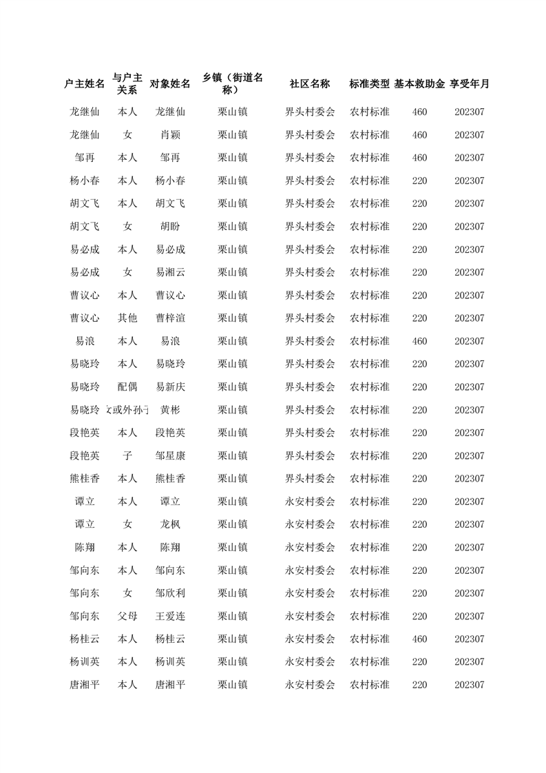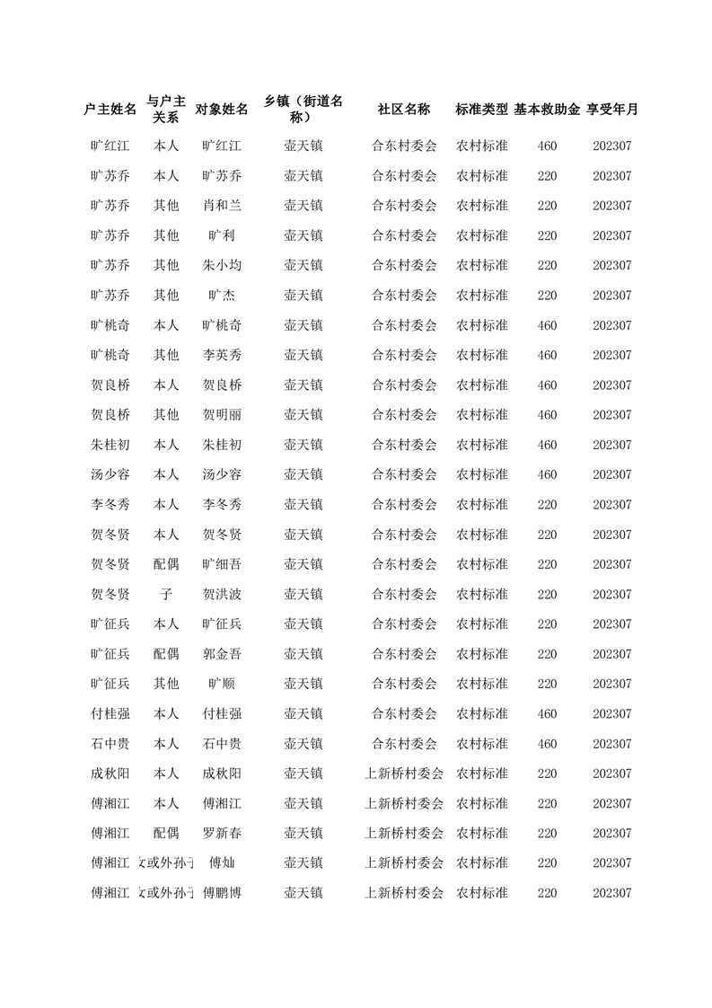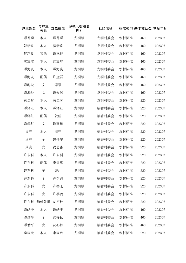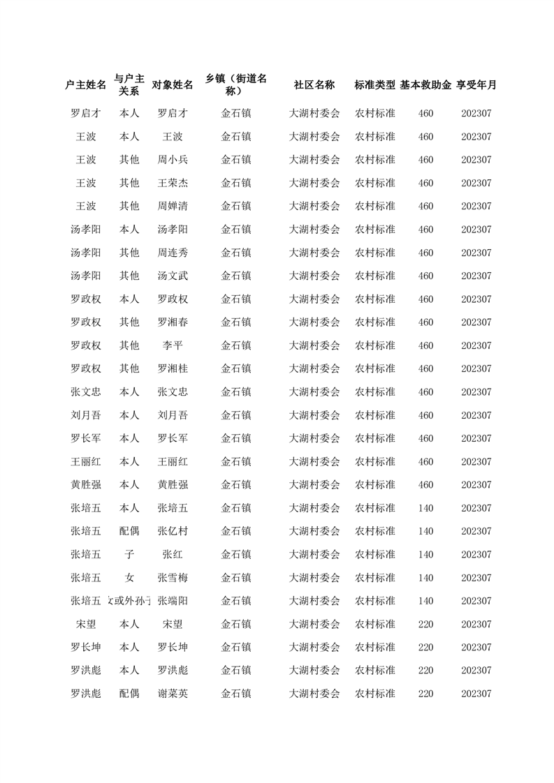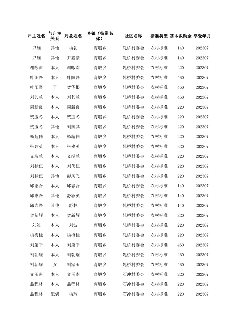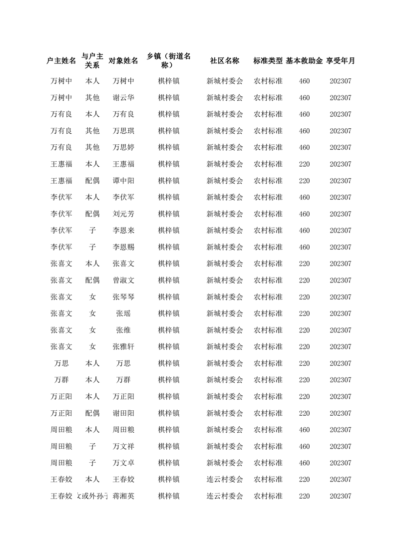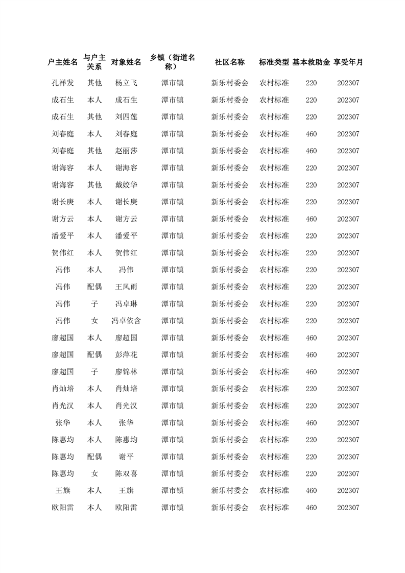 湘鄉市2023年7月份農村低保救助對象審批匯總表