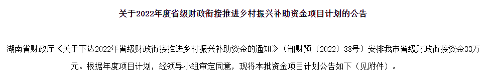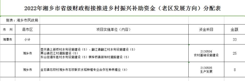 2022年湘鄉市省級財政銜接推進鄉村振興補助資金(老區發展方向)分配表