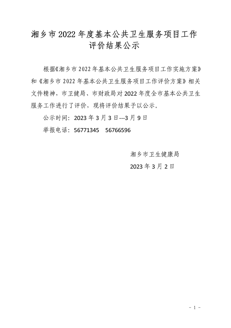 湘鄉市2022年度基本公共衛生服務項目工作評價結果公示