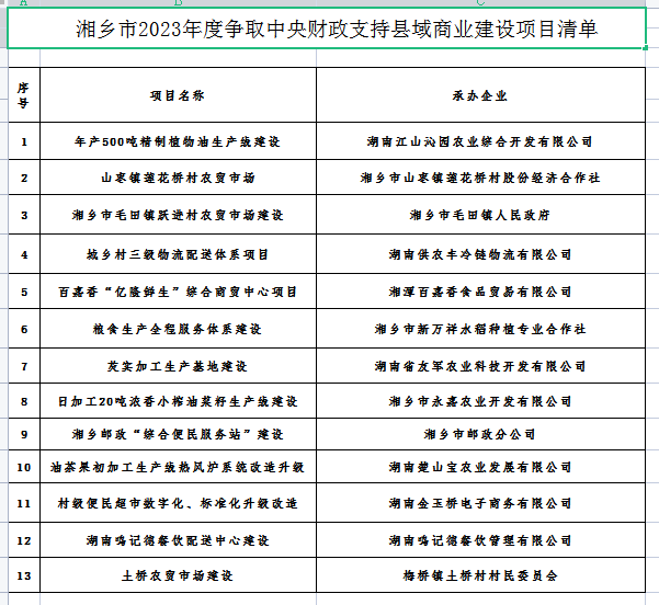 湘鄉市2023年度爭取中央財政支持縣域商業建設項目清單公示