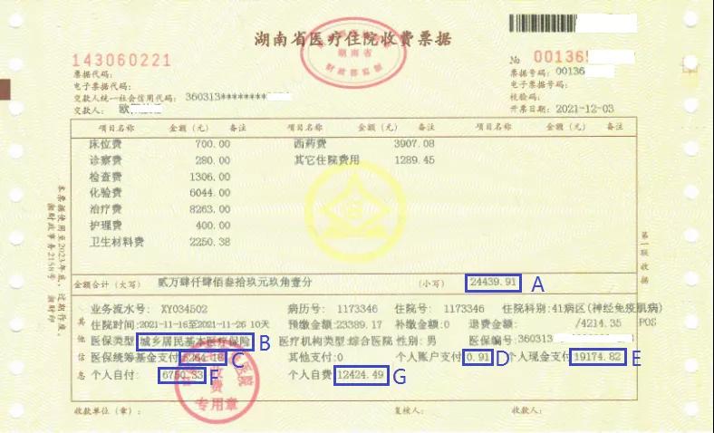 前面講到,醫(yī)療總費用是由醫(yī)保政策范圍內(nèi)、外兩部分組成。醫(yī)保政策范圍內(nèi)部分,因為需要扣除起付線、部分政策自付部分,加之報銷比例不可能百分之百,所以除去醫(yī)保基金支付的,剩余也得個人支付,這就叫個人自付,即F:6750.33元。而醫(yī)保政策范圍外部分,顧名思義則知,基本醫(yī)保不予支付,就只能個人自費了,即G:12424.49元。