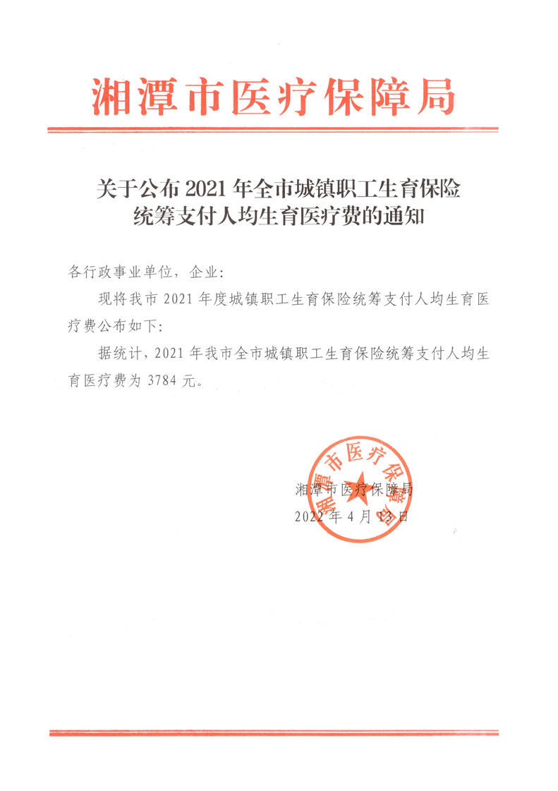 關于公布2021年全市城鎮職工生育保險統籌支付人均生育醫療費用的通知