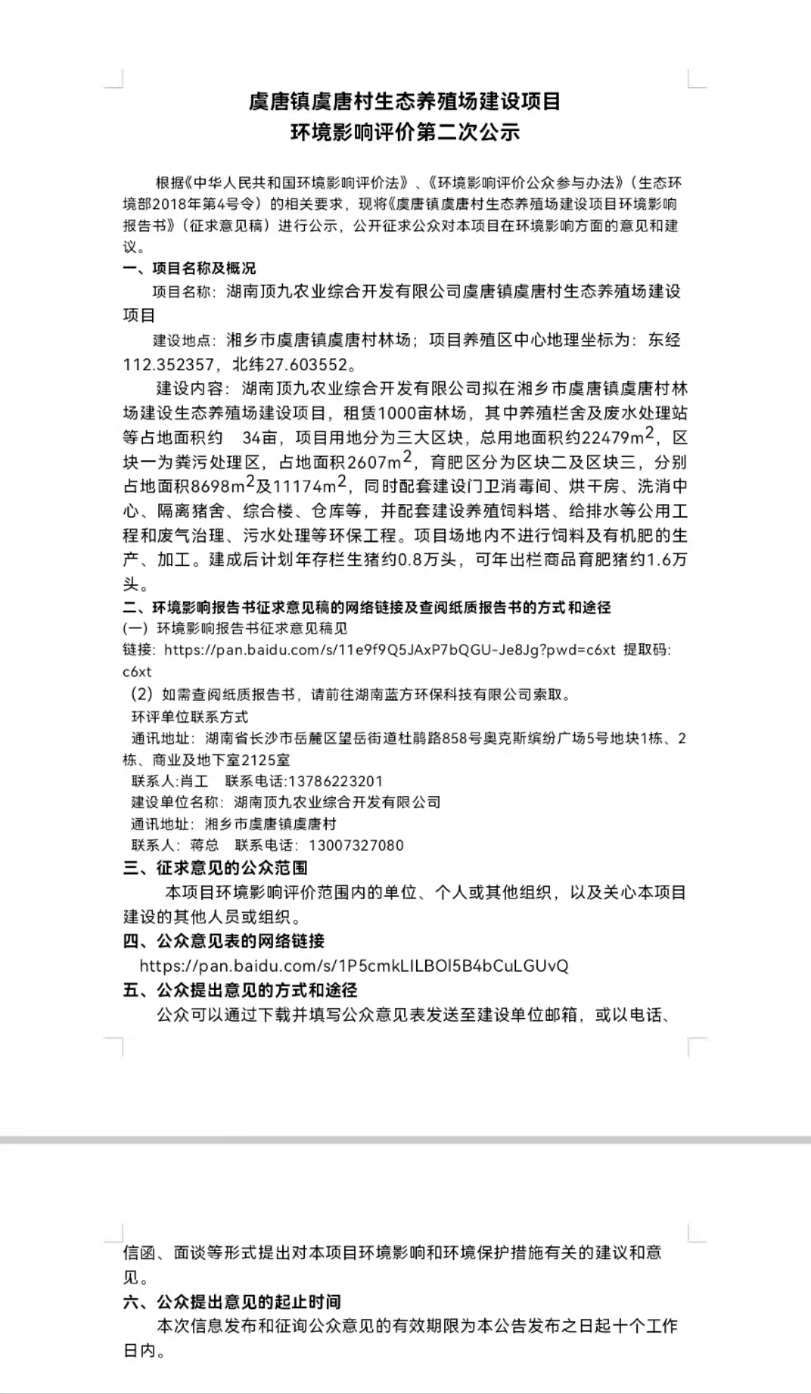 虞唐鎮虞唐村生態養殖場建設項目環境影響評價第二次公示