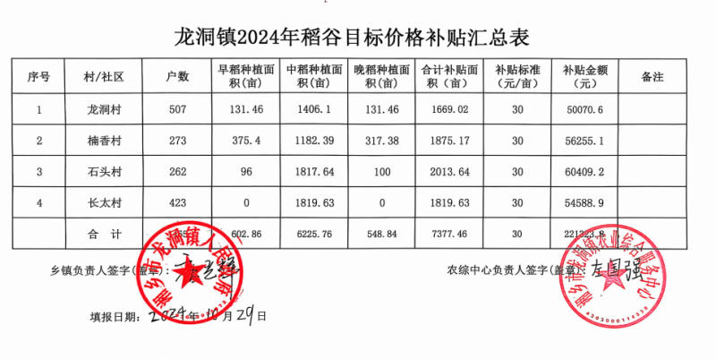 龍洞鎮(zhèn)2024年稻谷目標(biāo)價(jià)格補(bǔ)貼匯總表
