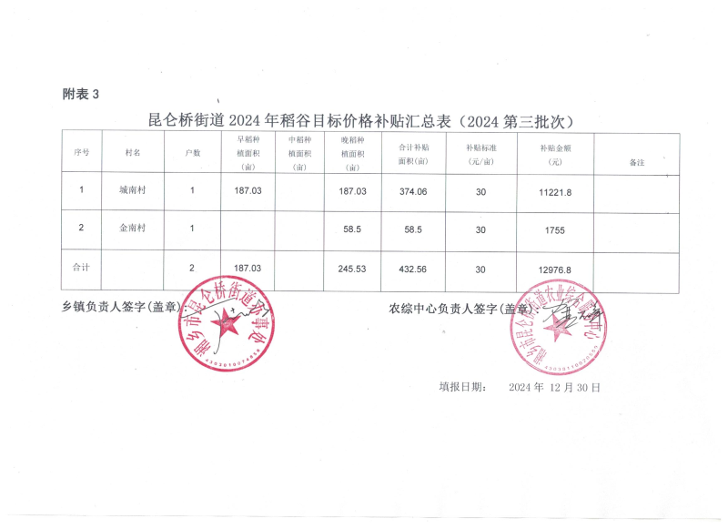 昆侖橋街道2024年稻谷目標價格補貼匯總表(2024第三批次)