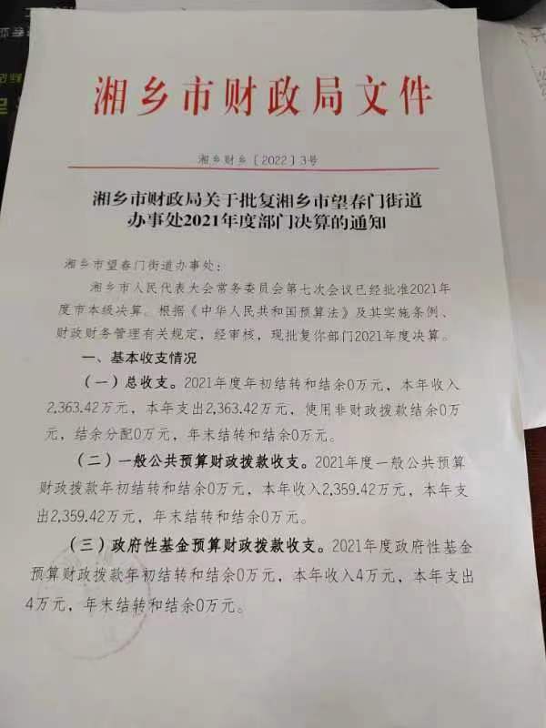 湘鄉(xiāng)市財(cái)政局關(guān)于批復(fù)湘鄉(xiāng)市望春門(mén)街道辦事處2021年度部門(mén)決算的通知