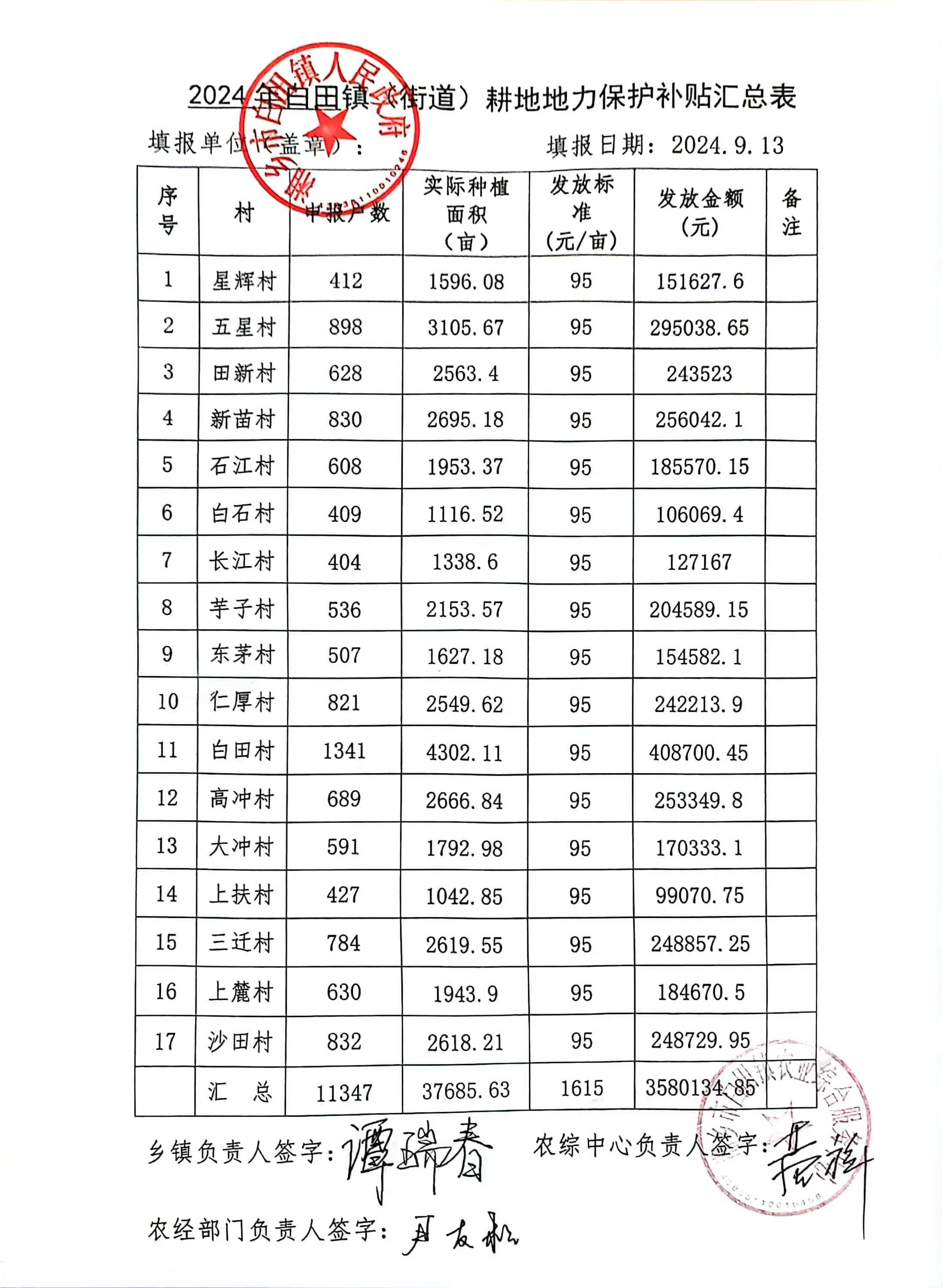 2024年白田鎮(街道)耕地地力保護補貼匯總表