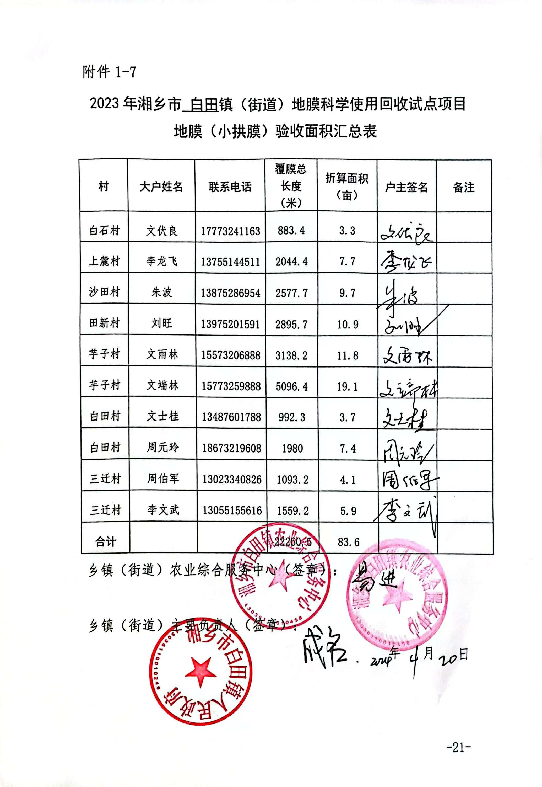 2023年湘鄉(xiāng)市白田鎮(zhèn)(街道)地膜科學(xué)使用回收試點項目地膜(小拱膜)驗收面積匯總表